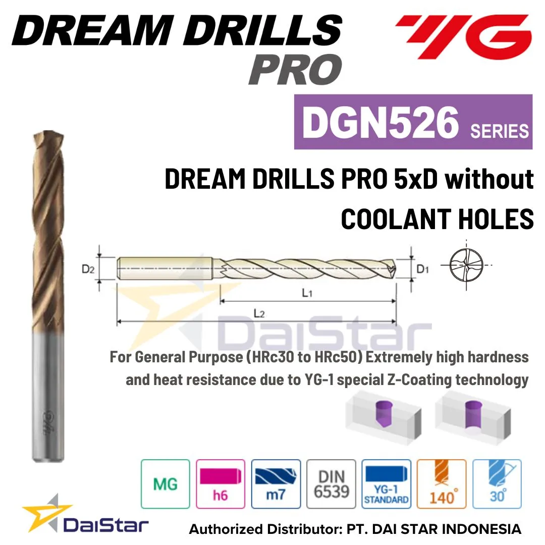 Kami adalah Distributor Resmi produk YG1 DGN526 Series – Solid Carbide Dream Drills Pro. Produk YG-1 adalah salah satu Brand yang sudah dikenal di seluruh dunia serta sudah banyak digunakan oleh berbagai industri manufaktur dengan beragam jenis dan kegunaan yang bermacam-macam.