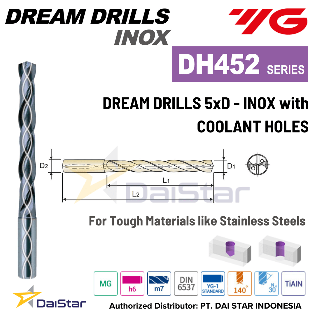 Spesifikasi DH452 Series – Carbide Dream Drill Inox 5XD Long with Internal Coolant Holes YG1