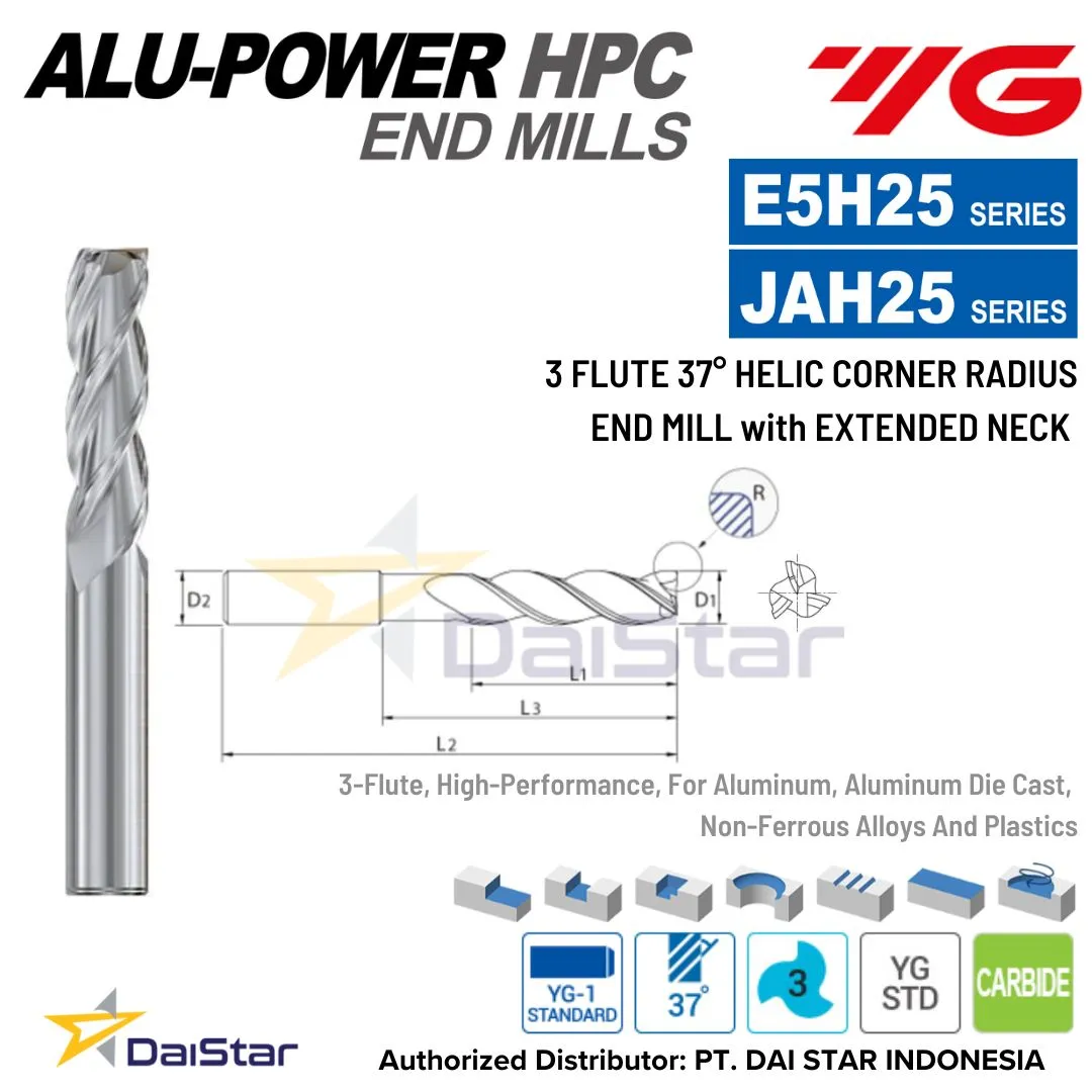 Spesifikasi E5H25/JAH25 Series ALU-POWER HPC – Solid Carbide Corner Radius with Extended Neck Endmill 3 Flute YG-1