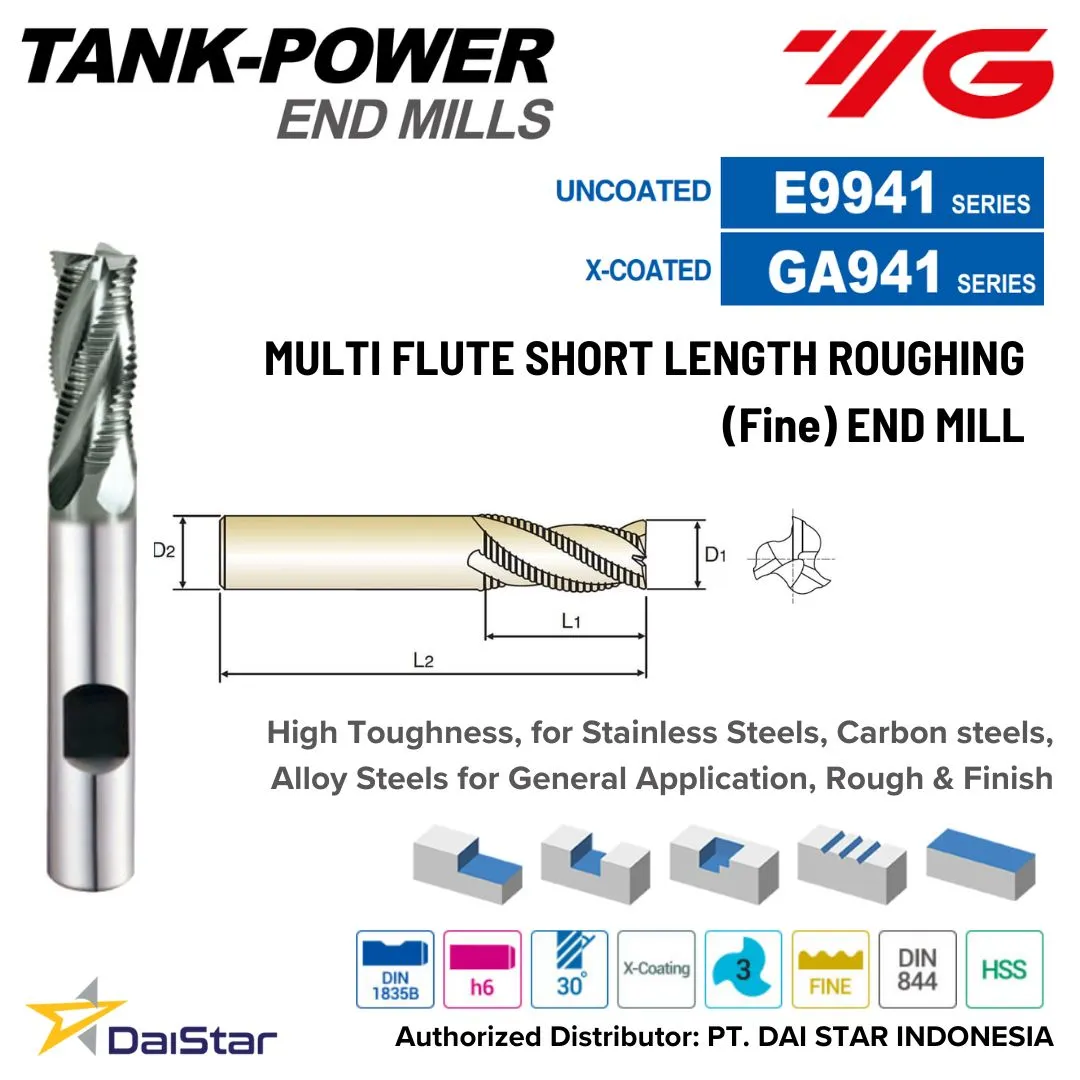 Spesifikasi E9941/GA941 Series TANK POWER – HSS-PM Roughing End mill Multi Flute short Length – Fine YG1