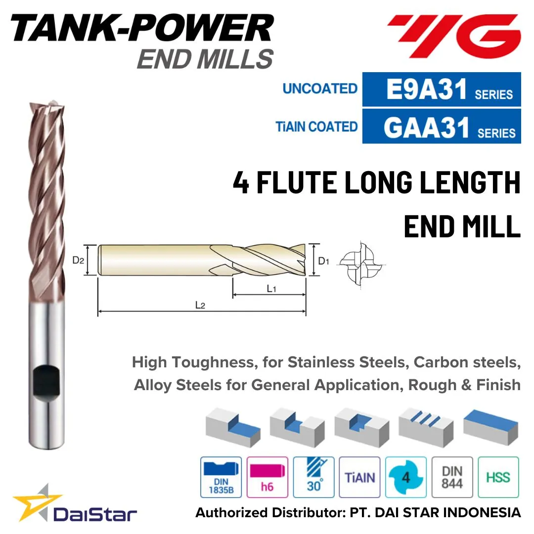 Spesifikasi E9A31/GAA31 Series TANK POWER – HSS-PM Square End mill 4 Flute Long Length YG1
