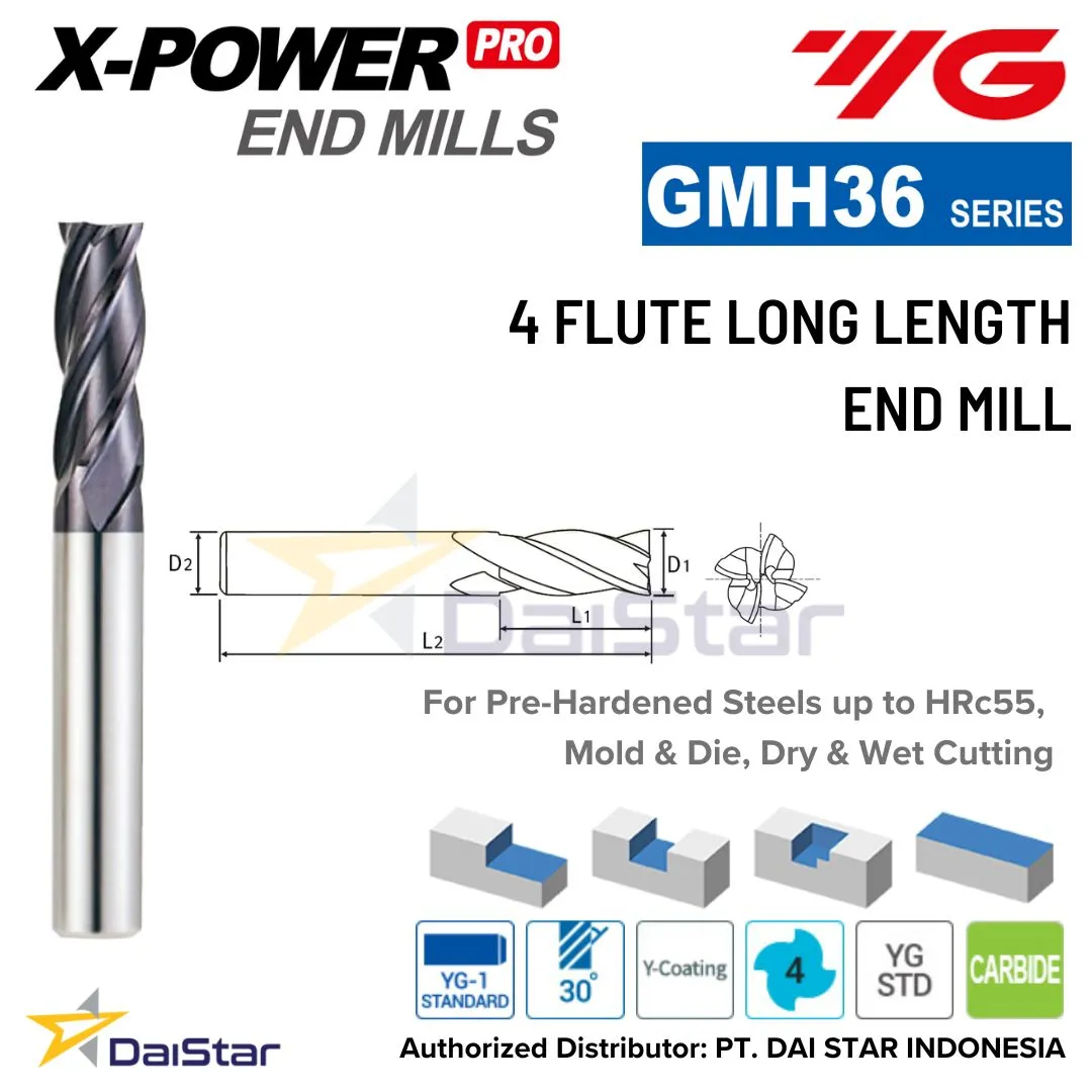 Spesifikasi GMH36 Series X-POWER PRO – Carbide Square End mill 4 Flute Long Length YG1