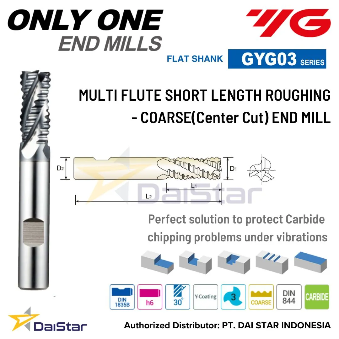 Spesifikasi GYG03 SERIES ONLY ONE – COATED PM60 CORNER RADIUS ROUGHING END MILL MULTI FLUTE SHORT LENGTH – COARSE (Center Cut) YG1