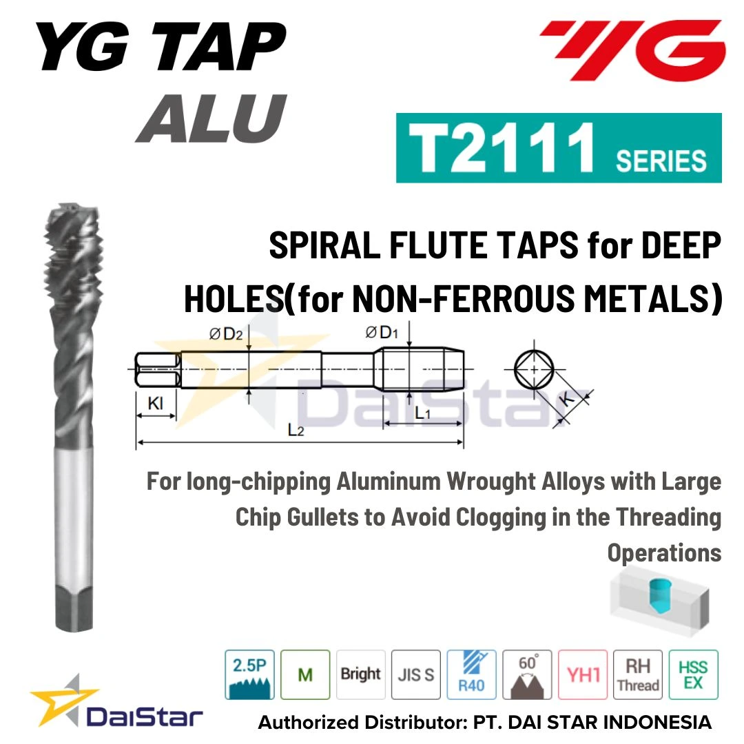 Spesifikasi T2111 Series – Spiral Flute Tap for Deep Holes(for Non-Ferrous Metals) YG1